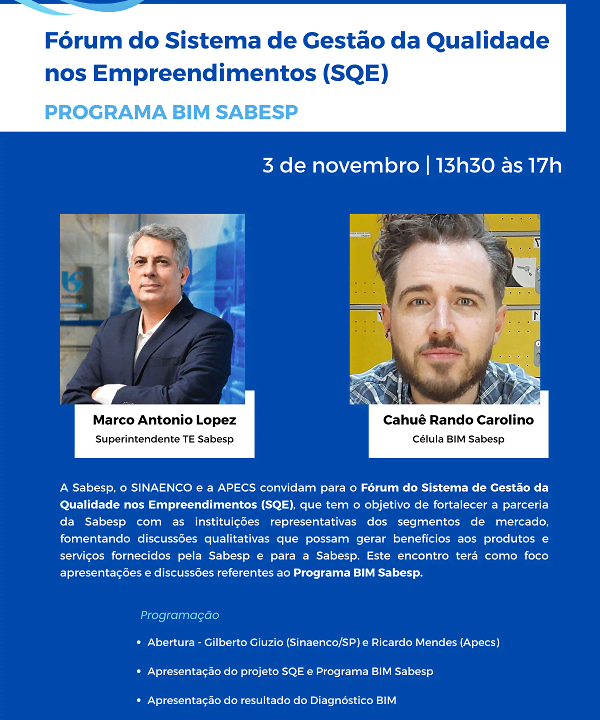 Fórum do Sistema da Gestão da Qualidade nos Empreendimentos SQE Programa BIM Sabesp 3 de novembro das 13h30 às 17h A Sabesp, o SINAENCO e a […]