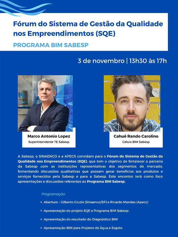 Fórum do Sistema da Gestão da Qualidade nos Empreendimentos SQE Programa BIM Sabesp 3 de novembro das 13h30 às 17h A Sabesp, o SINAENCO e a […]