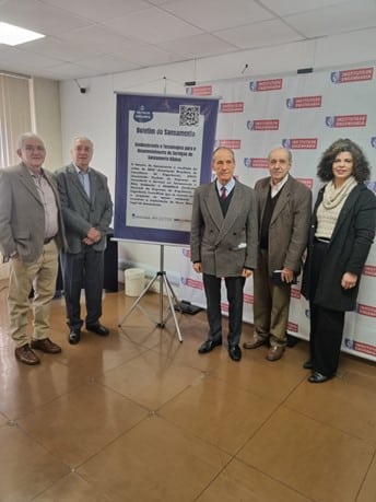 Foto BS – da esquerda para direita: Marco Antonio Guardia – conselheiro da Apecs e coordenador do BS, Paulo Ferreira (palestrante), ex-secretário nacional de saneamento e ex-presidente do IE, Luciano Afonso Borges – Diretor Técnico e Coordenador do GT Apecs, André Luiz Barros (Maubertec) – associado da Apecs e Rubiane Cruvinel Bremenkamp (LBR) – associada da Apecs.