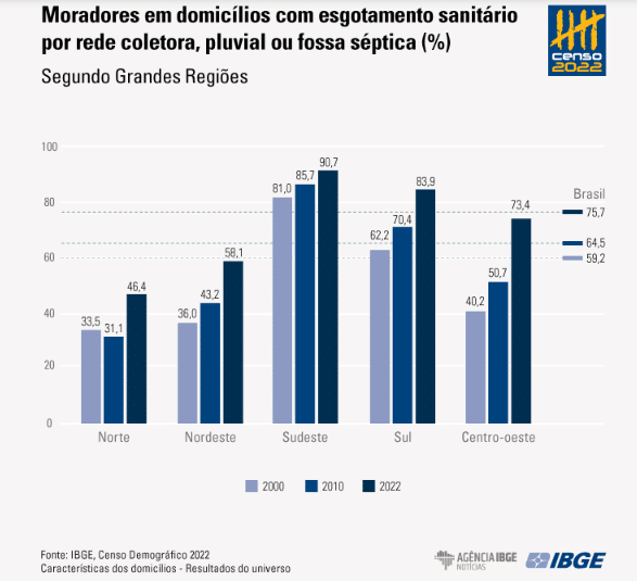 Segundo a pesquisa do IBGE, cerca de 62,5% dos domicílios brasileiros tinham acesso à rede de coleta de esgoto em 2022