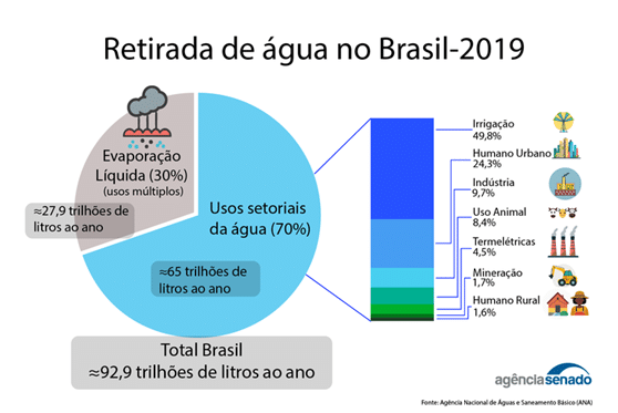 De acordo com dados apresentados por Veneziano, a agricultura representa 70% do consumo total de água no Brasil. Ele defende que o reúso da água “é de uma necessidade ainda mais premente no setor agrícola”, que poderia ser favorecido com o tratamento adequado do esgoto para ser utilizado na irrigação, segundo ele.