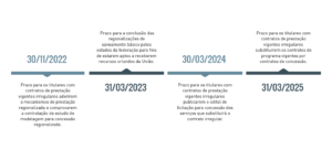 Caso se opte por uma prestação regional por meio de uma nova concessão conjunta, os contratos vigentes firmados individualmente com cada município (desde que “regulares”) poderão ser “equalizados” (prorrogados ou reduzidos) para que a data de término seja igual para todos e coincida com a data de início da nova concessão. O decreto define que a data de convergência do término dos contratos regulares não seja posterior a três anos da assinatura dos respectivos aditivos de redução ou prorrogação.