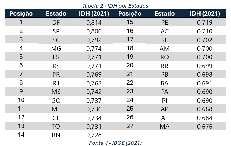 Quando adentramos o território nacional, constatamos o IDH dos estados conforme os dados obtidos pelo Instituto Brasileiro de Geografia e Estatística (IBGE), indicados na Tabela 2, porém a publicação mais recente trata do ano referência de 2021. É possível verificar que o Distrito Federal e São Paulo apresentam os dois maiores IDHs do Brasil, em contrapartida Maranhão e Alagoas apresentam os dois piores.