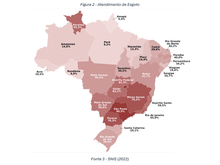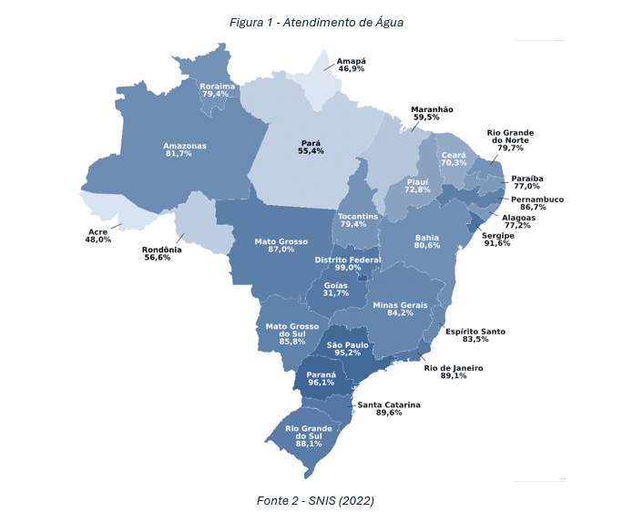 O painel do Sistema Nacional de Informações do Saneamento (SNIS), indica que em 2022 o Brasil contava com um atendimento de rede de abastecimento de água potável de 84,9% e rede de esgotamento sanitário de 56,0%. Em 2010 o atendimento era respectivamente 81,1% e 46,2%, o que nos leva a entender que em 12 anos tivemos um avanço de 3,8 pontos percentuais para água e 9,8 pontos percentuais para esgoto. Outro dado relevante a ser destacado é que o Brasil apresenta uma perda em sua distribuição de água de 37,8%, assim como do seu total de coleta de esgotamento sanitário, apenas 52,2% são tratados.