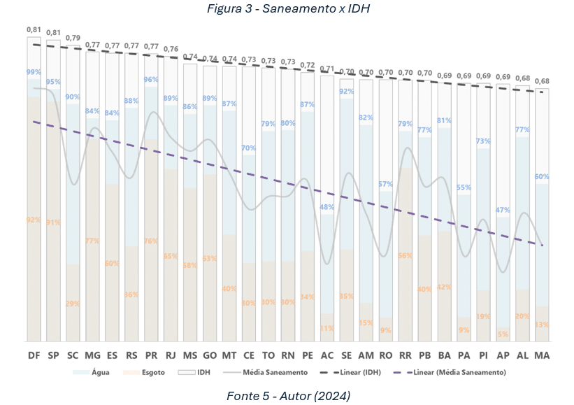 A Figura 3 ilustra os percentuais de atendimento de água, esgoto e a média dos dois serviços, em paralelo ao desenvolvimento humano, elencando os estados do maior para o menor IDH, com destaque para as linhas de tendência.