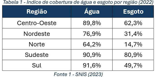 Quando estratificamos por regiões os serviços de saneamento, ou seja, abastecimento de água e esgotamento sanitário, de acordo com o Diagnóstico Temático de Serviços de Água e Esgoto, em sua visão geral publicada no ano de 2023 referente ao ano de 2022, podemos verificar na Tabela 1 os índices de atendimento de água e esgoto.