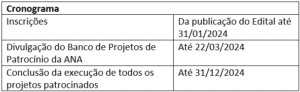 A Agência Nacional de Águas e Saneamento Básico (ANA) publicou, no Diário Oficial da União desta quarta-feira, 13 de dezembro, o edital de seleção pública de eventos e projetos que serão avaliados para a concessão de patrocínio pela Agência para ações que acontecerão em 2024. O objetivo é ampliar a transparência ao processo de seleção e a racionalidade na aplicação dos recursos para essa finalidade. As inscrições estão abertas até as 23h59 de 31 de janeiro de 2024, uma quarta-feira, de acordo com as regras estabelecidas no edital, e são gratuitas.