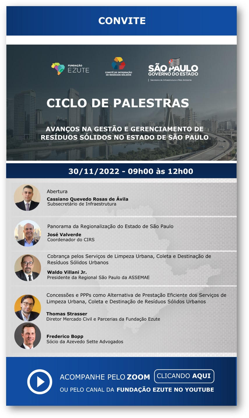 A Secretaria de Infraestrutura e Meio Ambiente e a Fundação EZUTE, realizarão Ciclo de Palestras “Avanços na Gestão e Gerenciamento de Resíduos Sólidos no Estado de São Paulo”