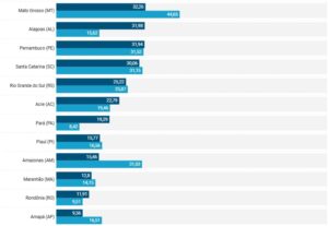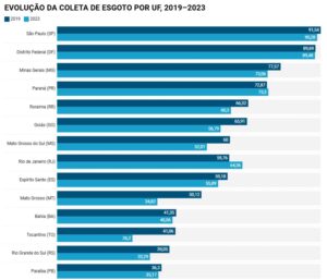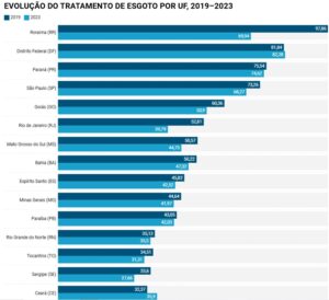 O Piauí foi o estado que mais avançou nos últimos anos, registrando um ganho de 19,24 pontos percentuais. Apesar desse progresso, dois estados da região Norte ainda têm menos de 10% da população com acesso ao esgotamento sanitário: Acre, com 8,75%, e Amapá, com 4,93%.
