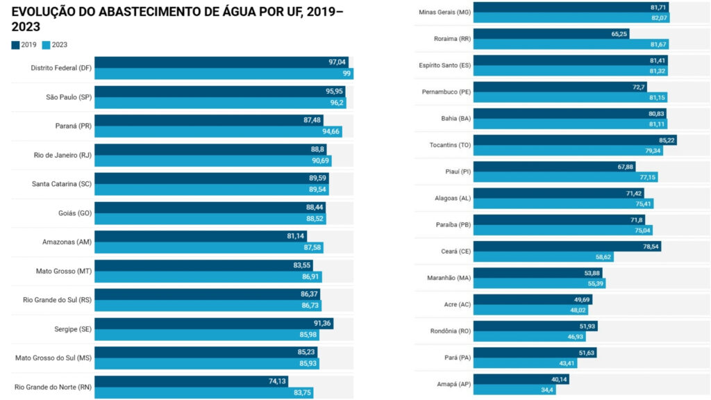 Segundo o levantamento, nenhuma unidade da federação brasileira atingiu a meta do Marco Legal do Saneamento Básico de 99% da população coberta com abastecimento de água. Entretanto, a maior evolução registrada foi do Ceará, com um avanço de 19,92%.