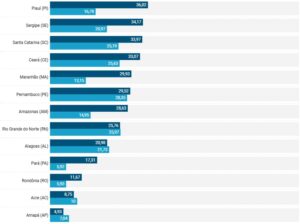 O Piauí foi o estado que mais avançou nos últimos anos, registrando um ganho de 19,24 pontos percentuais. Apesar desse progresso, dois estados da região Norte ainda têm menos de 10% da população com acesso ao esgotamento sanitário: Acre, com 8,75%, e Amapá, com 4,93%.